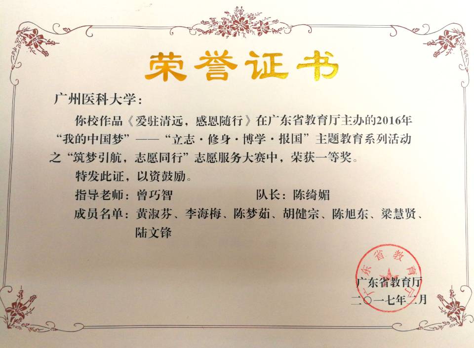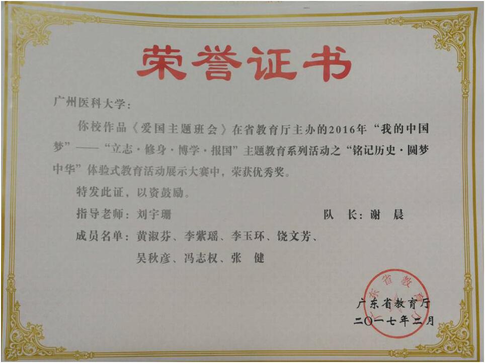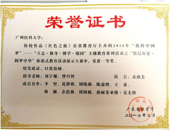 学生在广东省教育厅2017年2月公布的“我的中国梦——立志 修身 博学 报国”主题教育系列活动中荣获一等奖两项(全校仅三项),优秀奖一项。