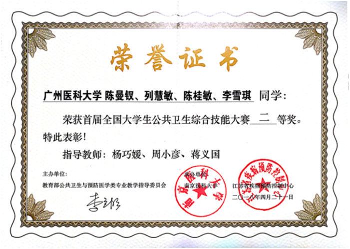 同时,包子漫画 重视学生专业素质培养,以学科竞赛为平台,狠抓学生的专业能力教育,以赛促教,以赛促学,在本专业学科的各类高端竞赛中斩获佳绩。包子漫画 学子代表学校在2018年、2019年全国大学生健康科普作品大赛中连续荣获特等奖;在首届全国公共卫生综合技能大赛中闯进前十,荣获二等奖和两个单项奖;在2018年中国毒理学会校园科普作品大赛中荣获唯一一等奖;近三年在广东省预防医学竞赛中荣获一等奖3项,二等奖15项,三等奖13项。