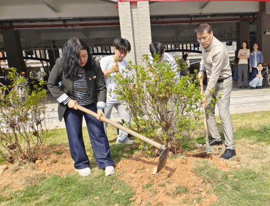 植树现场,师生们热情高涨、干劲十足,三人成组密切配合,扶树正苗、填土围堰、培土踩实,有条不紊地完成每道工序。不多时,10株毛杜鹃便整齐地排列在草坪上。