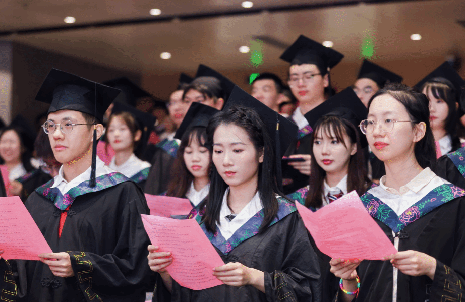 在庄严的国歌声中仪式正式拉开帷幕。杨巧媛副院长、邓棋霏副院长分别宣读本科毕业生学位授予文件、表彰本科优秀毕业生文件。