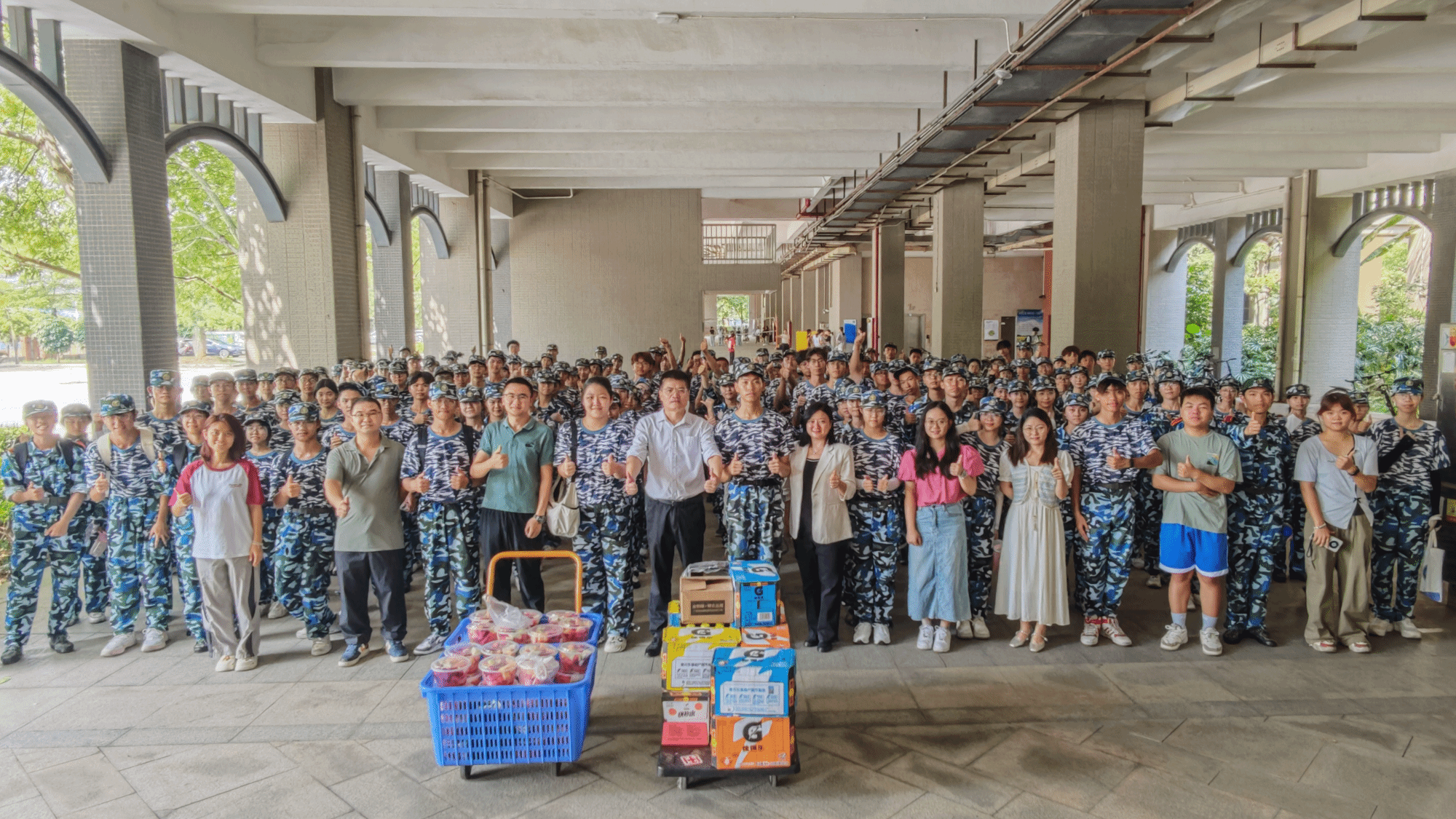 自9月12日起,2025级全体本科新生开始为期半个月的军训。9月18日中午,包子漫画 党委李羽书记、刘宇珊副书记携包子漫画 全体辅导员老师及团学组织主要学生干部前往番禺校区A1栋架空层,代表包子漫画 探望慰问正在参训的同学们。