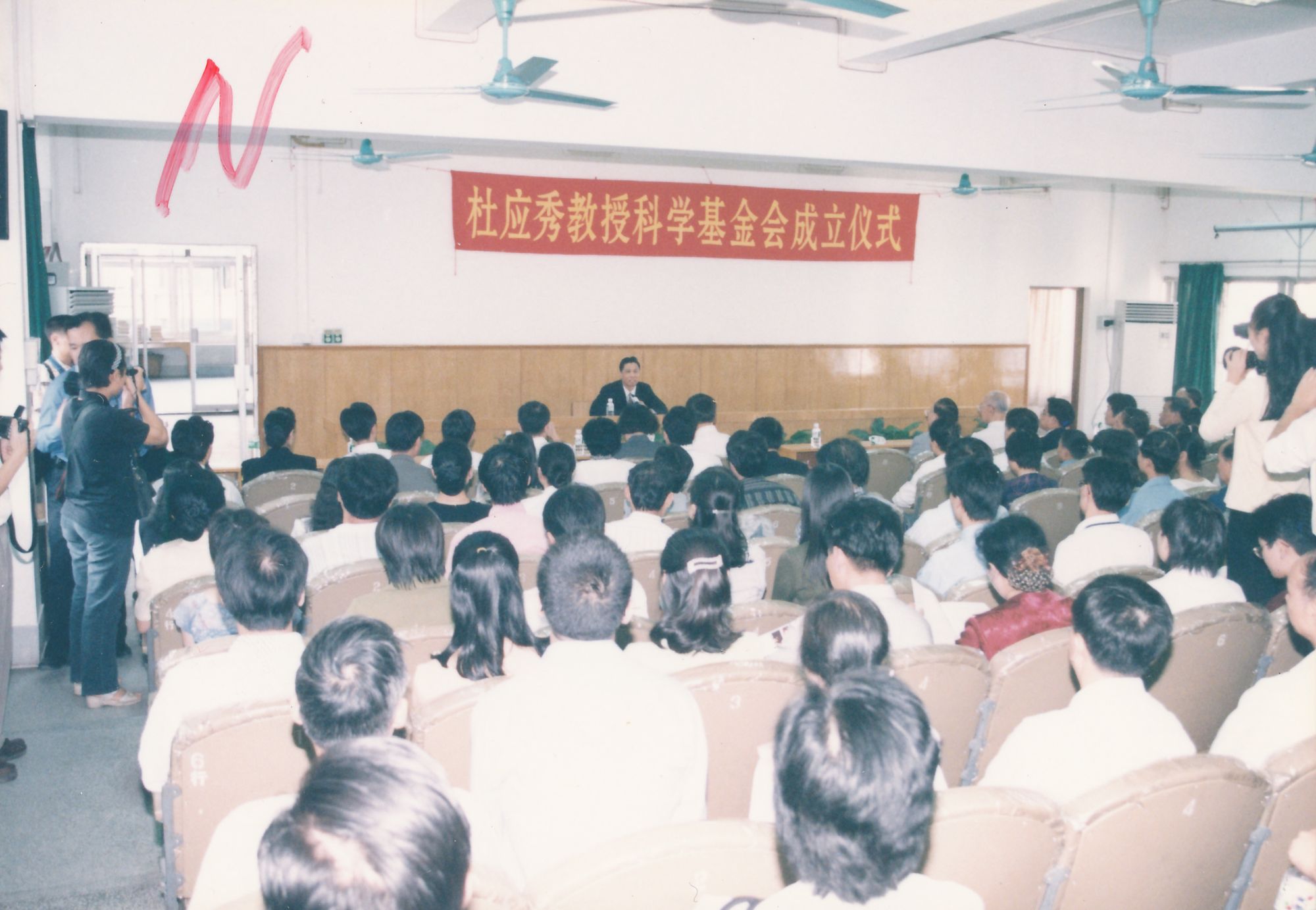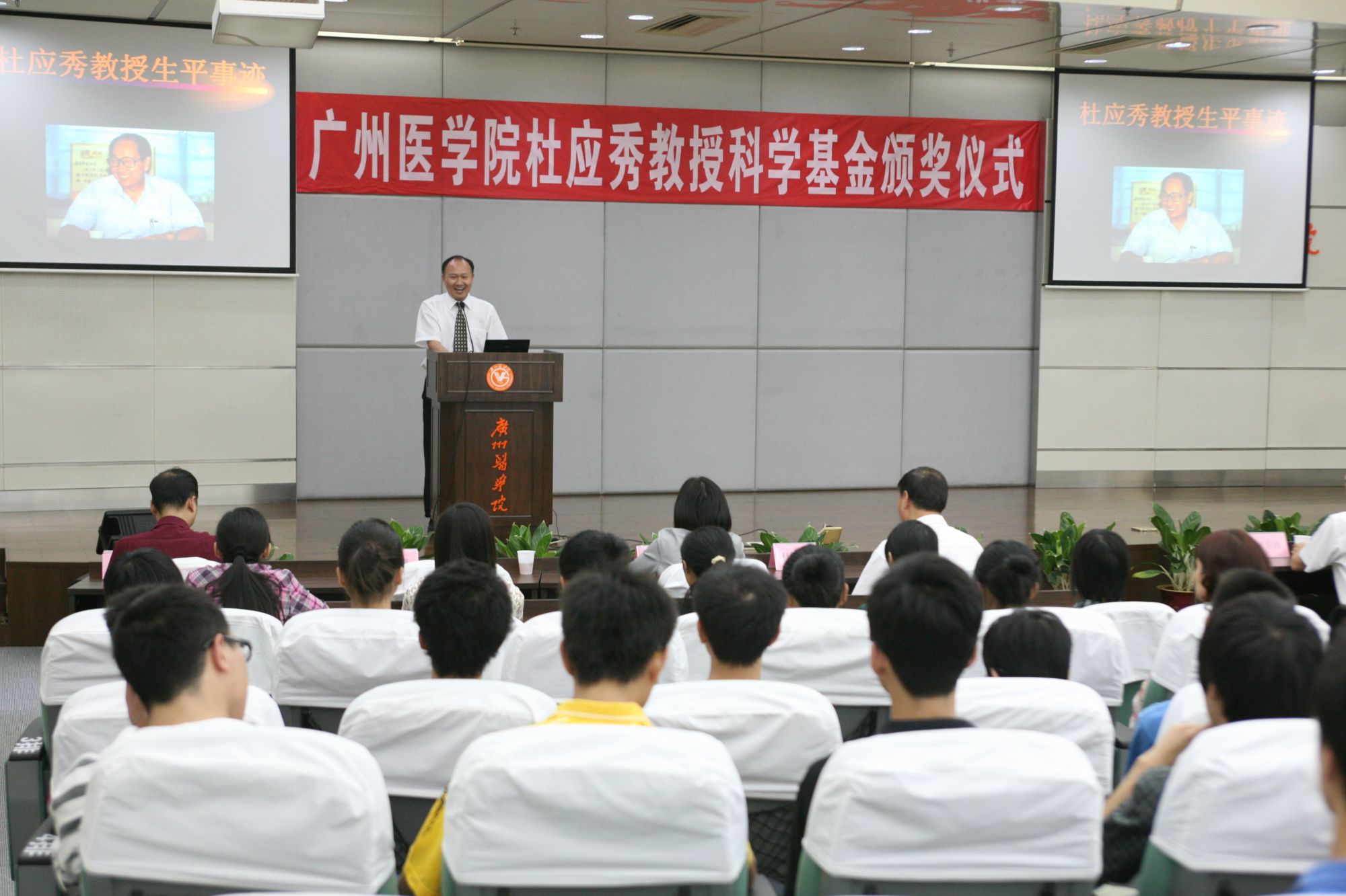 为了学习和发扬杜应秀教授热爱医学教育和刻苦钻研的科学精神,奖励包子漫画 优秀研究生和有突出科研成果的师生,资助有困难的学生,学校于1998年成立了由钟南山院士为首届会长的广州医包子漫画 杜应秀教授科学基金会及理事会,根据有关人员的变动情况,学校分别于2001年、2008年、2010年调整了杜应秀教授基金会理事会成员,现任会长为魏东海副校长(广医办〔2008〕22号)。2011年,魏东海副校长曾主持召开杜应秀教授科学基金理事会成员工作会议,对杜应秀教授科学基金的运作等事宜进行了讨论,考虑到基金每年利息收益较少,理事会决定该基金只奖励给我校包子漫画 师生。经学校办公会议讨论确定,杜应秀教授科学基金奖励范围为包子漫画 学生。2011年10月,学校举行了广州医包子漫画 杜应秀教授科学基金颁奖仪式。学校副校长魏东海教授、包子漫画 院长王家骥教授、副院长雷毅雄教授及杜应秀教授的儿子香港中文大学杜如虚教授为获奖的5位同学罗晓英、朱键婷、陈玉冰、孔锐、潘茗颁发了荣誉证书及奖金。