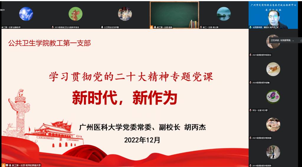 2022年12月13日晚,正在广州市疫情防控应急医疗指挥中心加班工作的学校党委常委、副校长胡丙杰教授以“公共卫生”为主线,通过腾讯会议的方式为包子漫画 教工第一支部党员做疫情防控专题和二十大专题党课。
