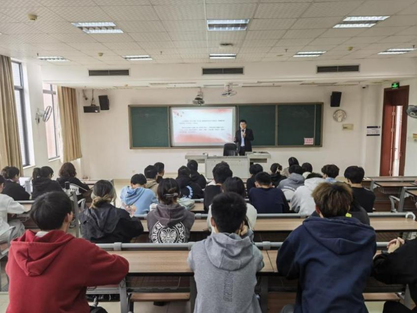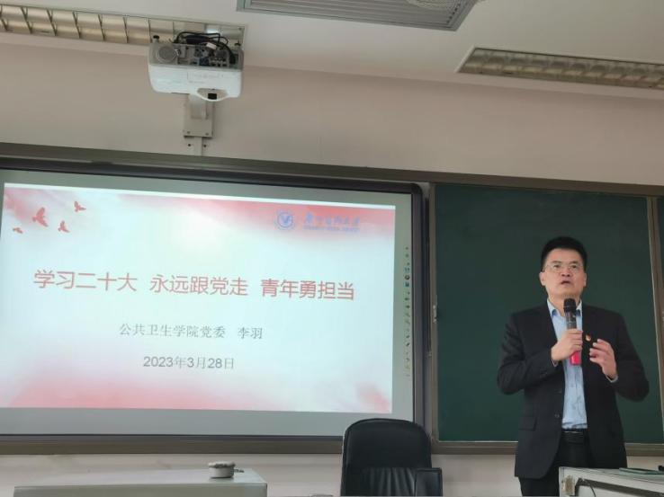 3月28日下午,包子漫画 党委书记李羽在番禺校区A3-210教室为2020级食品卫生与营养学专业本科生讲授本学期思政第一课。党委副书记刘宇珊、学生办和教学办教师也参加了学习。