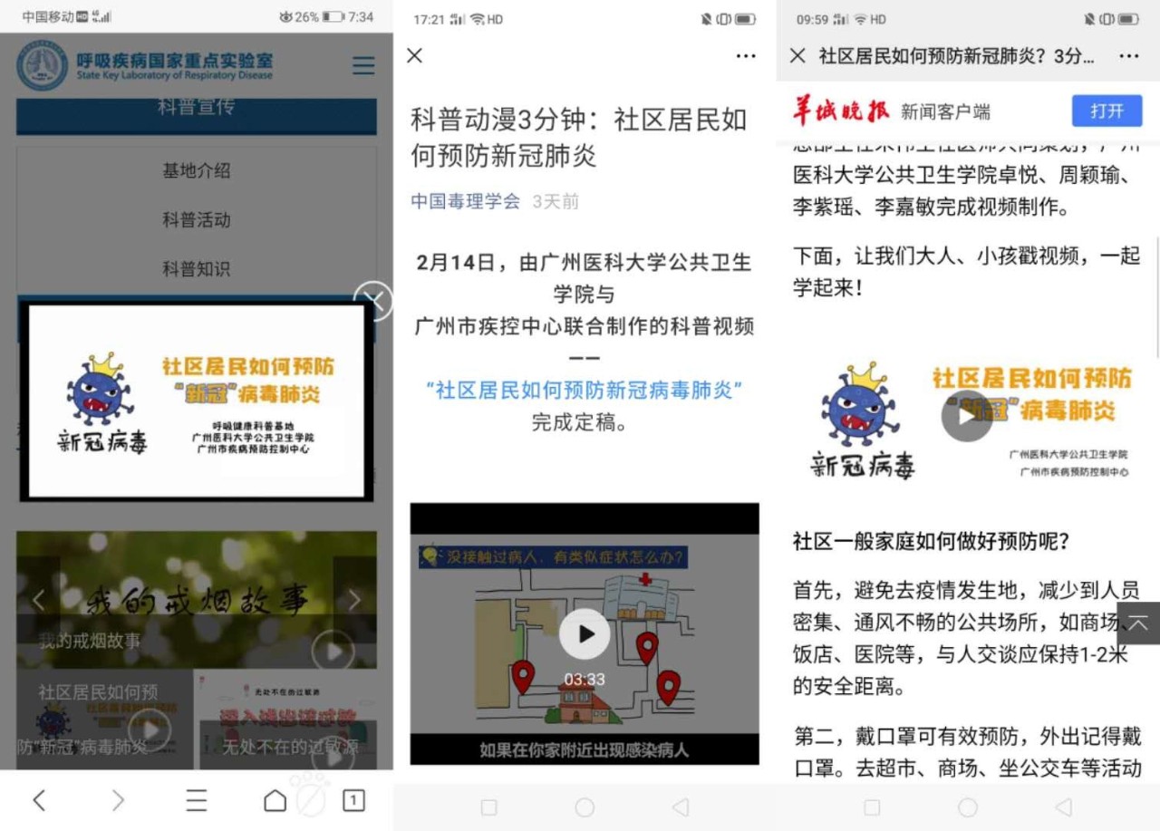 该科普微视频自2月初开始筹划,历时两周,在多位老师指导下,由公卫包子漫画 2015级预防医学专业本科生卓悦、周颖瑜、李紫瑶、李嘉敏制作完成。本卡通视频形式生动地介绍了新型冠状病毒的传播途径、社区居民预防感染的方法,以及隔离和就医的指引,能帮助大众快速普及相关预防知识,有助于社区疫情防控工作的开展。视频在广州医科大学、广州市疾病预防控制中心的官微上线后受到广泛好评并迅速传播,广州市部分社区将其作为疫情防控宣传教育的材料。该视频还在中华预防医学会官微、中国毒理学会官微、羊城晚报官微、呼吸疾病国家重点实验室官微、广州市科协等机构的官微和网站平台收录、转载和推广,起到了良好的科普宣教的效果,助力于社区新冠病毒肺炎的防控。