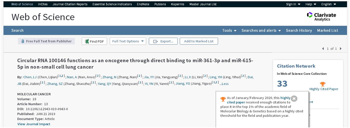 根据国际最新公布的ESI数据显示,我校公卫包子漫画 2篇研究论文入选ESI高被引论文。一篇是“Circular RNA 100146 functions as an oncogene through direct binding to miR-361-3p and miR-615-5p in non-small cell lung cancer”,该文2019年发表于一区杂志Molecular Cancer(IF10.6),第一作者为硕士生陈丽剑,通讯作者为蒋义国教授。论文报道了环状RNA 100146在环境致癌物苯并芘诱导肺细胞恶变中具有重要作用。