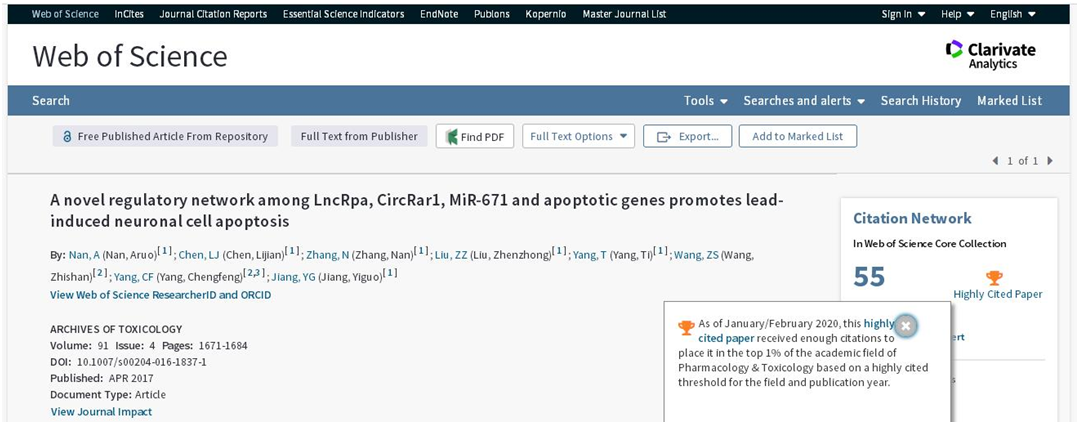 另一篇研究论文是“A novel regulatory network among LncRpa, CircRar1,MiR-671 and apoptotic genes promotes lead-induced neuronal cell apoptosis”,于2017年发表于著名毒理学一区杂志Archives of Toxicology (IF 5.7),第一作者为博士生南阿若,通讯作者为蒋义国教授。该论文首次发现细胞中存在miRNA、lncRNA及circRNA三类非编码RNA之间的调控,并揭示了其毒理学意义。该文曾在2019年就已入选高被引论文,2020年再度入选。