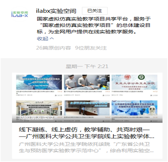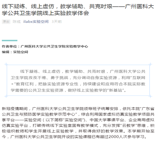 近日,公卫包子漫画 实验教学中心对本学期线上实验教学辅助的经验总结文章“线下凝练、线上虚仿,教学辅助、共克时艰——包子漫画 线上实验教学体会”,在国家虚拟仿真实验教学项目共享平台官方微信公众号“实验空间”上发布推送,引起了广泛关注。
