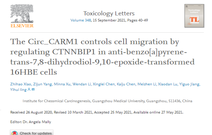 近日,国际毒理学主流期刊Toxicology Letters在线发表了包子漫画 在读本科生萧志昊等人的研究论文“Thecirc_CARM1 controls cell migration by regulating CTNNBIP1 in anti-benzo[a]pyrene-trans-7,8-dihydrodiol-9,10-epoxide-transformed 16HBE cells”。该研究以苯并芘代谢致癌物anti-BPDE诱导恶性转化的人气道上皮细胞模型,分析鉴定了环状RNA分子circ_CARM1在恶性细胞中的功能及作用机制。研究发现circ_CARM1通过与微小RNA miR-1288-3p相互作用,调节CTNNBIP1(β-catenin相互作用蛋白1)的表达,影响转化细胞的恶性特征。该研究为进一步阐明外源化学物致癌的表观遗传学机制提供了依据。