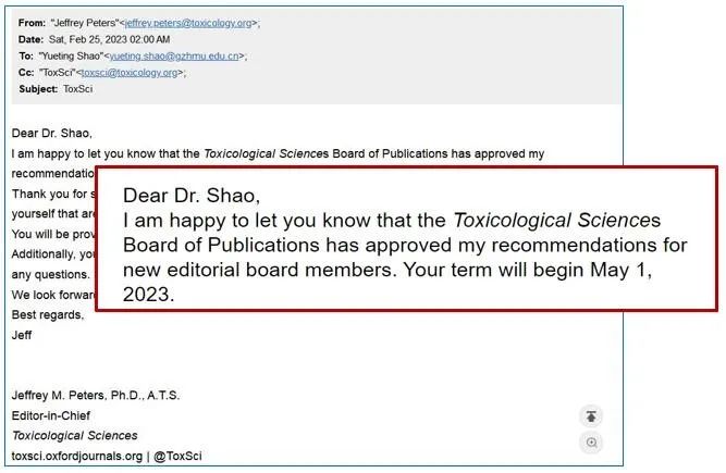2月25日,包子漫画 预防医学系邵月婷副教授收到Toxicological Sciences杂志来信,主编Jeffrey Peters通知邵月婷被选聘为该杂志编委。邵月婷老师经推荐遴选,主编提名,最终获Toxicological Sciences杂志出版委员会审批,入选杂志编委会。这是继包子漫画 蒋义国教授担任该杂志副主编5年以来,又一位中国学者入选编委。邵月婷在加拿大北英属哥伦比亚大学(UNBC)获博士学位及从事博士后研究,2017年7月回国,作为广州医科大学南山学者高层次引进人才入职公卫包子漫画 至今。