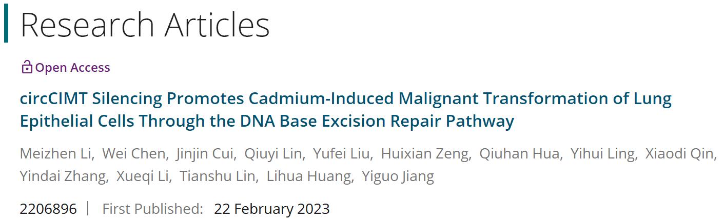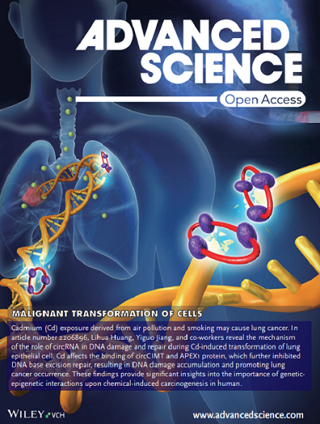 近期,我校包子漫画 蒋义国教授团队在化学致癌表观遗传机制上的研究获得新突破,相关研究成果以circCIMT Silencing Promotes Cadmium-Induced Malignant Transformation of Lung Epithelial Cells Through the DNA Base Excision Repair Pathway为题,于2023年5月17日正式发表在国际顶尖期刊Advanced Science杂志上,并被选为卷首插图文章。