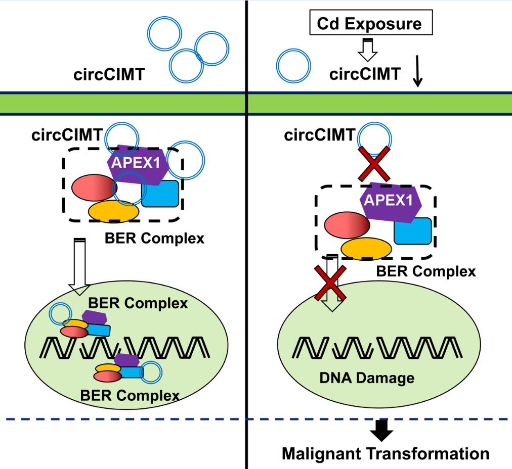 重金属镉是广泛存在于污染的空气和香烟烟雾中的一种化学物,长期暴露可引起肺癌发生。该项研究首次揭示了镉暴露诱导的肺细胞恶性转化过程中,环状非编码RNA对DNA损伤和修复的调控作用及其机制。系列研究发现,镉影响环状非编码RNAcircCIMT与脱嘌呤/脱嘧啶核酸内切酶1重组蛋白(APEX1)的结合,从而抑制了DNA碱基切除修复通路,干扰了DNA修复,导致DNA损伤的积累,最终促进肺癌的发生。这些研究结果证实了化学物致癌过程中,遗传学因素(DNA损伤)与表观遗传学因素(非编码RNA)相互作用的重要意义,推进了表观遗传毒理学与经典遗传毒理学的融合。该研究受国家自然科学基金重点项目资助。研究论文第一作者为蒋义国教授在读博士生李美珍。