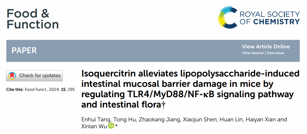 2024年1月2日,国际食品营养学领域知名杂志Food & Function发表了包子漫画 2023届本科生唐恩慧为第一作者的研究论文“ Isoquercitrin alleviates lipopolysaccharide-induced intestinal mucosal barrier damage in mice by regulating TLR4/MyD88/NF-κB signaling pathway and intestinal flora”。 包子漫画 吴鑫兰老师为该论文的唯一通讯作者。 Food & Function是国际食品科技与营养学的知名期刊,影响因子为6.1,在中国科包子漫画 期刊分级系统中为一区期刊。