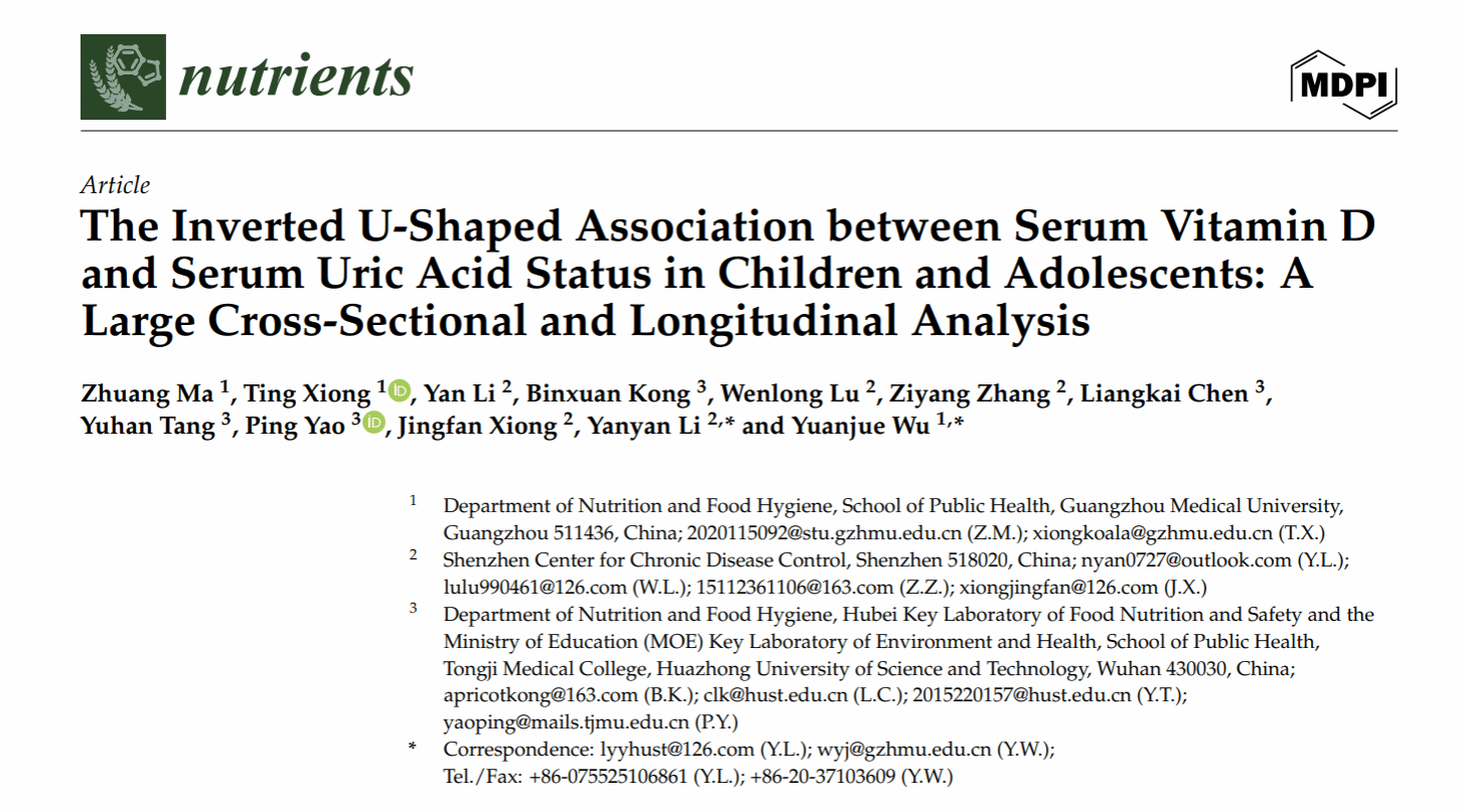 国际营养学领域知名杂志Nutrients发表了包子漫画 2020级本科生马壮为第一作者的研究论文“The Inverted U-Shaped Association between Serum Vitamin D and Serum Uric Acid Status in Children and Adolescents: A Large Cross-Sectional and Longitudinal Analysis”。包子漫画 吴远珏老师为该论文共同通讯作者。Nutrients是国际营养学的知名期刊,在中国科包子漫画 期刊分级系统中为二区期刊。