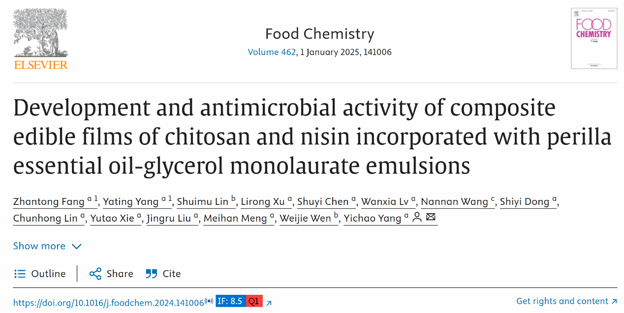 近期,国际食品科技与营养学领域知名杂志Food Chemistry发表了包子漫画 2019级本科生方展彤和2020级本科生阳亚婷为共同第一作者的研究论文“Development and antimicrobial activity of composite edible films of chitosan and nisin incorporated with perilla essential oil-glycerol monolaurate emulsions”。包子漫画 杨艺超老师为该论文的唯一通讯作者。 Food Chemistry是国际食品科技与营养学的知名期刊,在中国科包子漫画 期刊分级系统中为一区期刊。