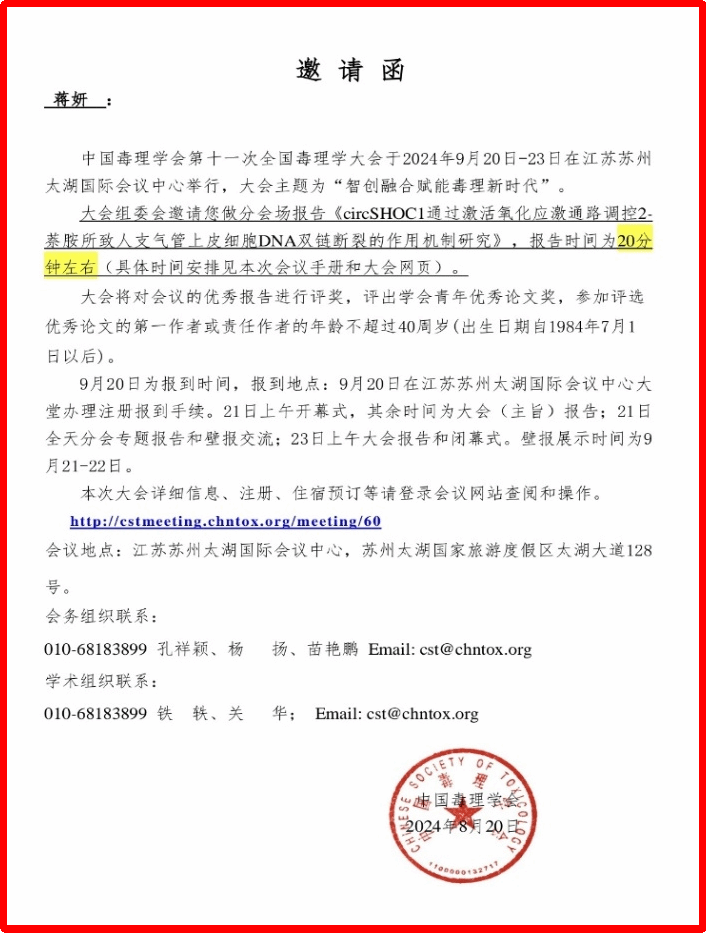中国毒理学会第十一次全国学术大会,2024年9月20日至23日在江苏省苏州市隆重召开。本次会议是国内毒理学最大且学术水平最高的学术盛会,来自全国各地的毒理学及相关领域的1300余名专家学者参加了会议。代表们分享研究成果,探讨科学问题,共同推动我国毒理学研究的创新发展与实践应用。我校包子漫画 蒋妍等4名本科生随指导老师参加了此次盛会,进行了交流学习。