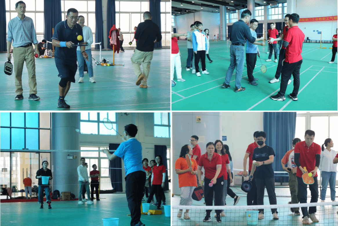 在主持人的详细介绍下,教师们对比赛规则有了清晰的了解,比赛环节也随之正式开始。本次趣味运动会共设置了四个比赛项目,分别是花式接羽毛球、羽毛球拍捞“鱼”、匹克球发球赛和匹克球颠球折返跑赛。这些项目不仅考验了教师们的身体素质,更考验了他们的团队协作能力和创新思维。