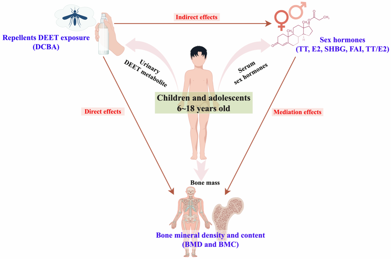 DEET为各种驱蚊产品的主要活性成分和最有效成分。前期该团队在广州社区老年人群研究中,发现DEET高暴露可增加老年人群骨质疏松和骨折发生风险。鉴于儿童青少年期是骨骼发育的关键阶段,DEET是否通过干扰性激素,损害该敏感生命阶段骨骼健康,目前尚缺乏相关证据。本研究将老年人群的探索性发现上溯至生命早期的低龄人群,经研究发现,DEET内暴露水平增加与性激素和骨量下降之间存在剂量-反应关系,提示DEET可能通过干扰性激素稳态损害骨量积累;进一步分析表明,低龄、非超重的儿童青少年为DEET暴露所致健康风险的敏感群体。这一发现为明确DEET高暴露可能带来的健康风险提供了重要科学证据。