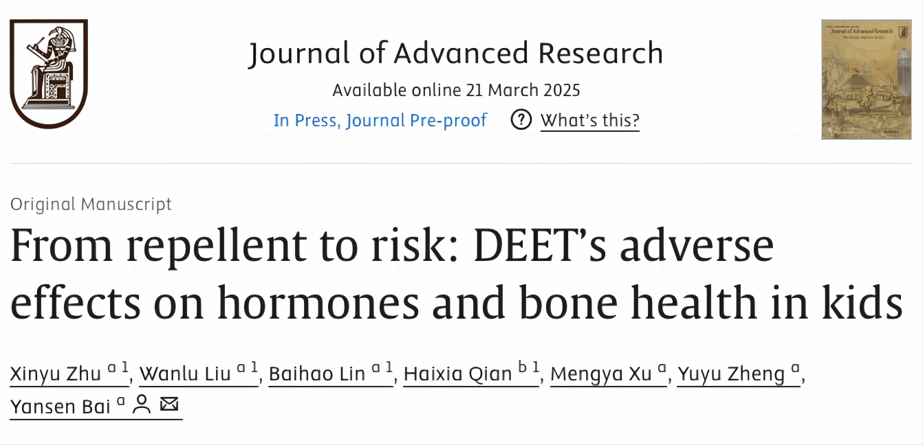 2025年3月21日,公卫包子漫画 白岩森教授团队在《Journal of Advanced Research》在线发表了题为“From repellent to risk: DEET's adverse effects on hormones and bone health in kids”的研究论文,揭示了驱蚊剂成分避蚊胺(DEET)高暴露可能通过干扰性激素水平,影响儿童与青少年的骨质累积。公卫包子漫画 硕士研究生朱心雨、林柏豪及博士后刘婉露为该论文共同第一作者,白岩森教授为论文唯一通讯作者。