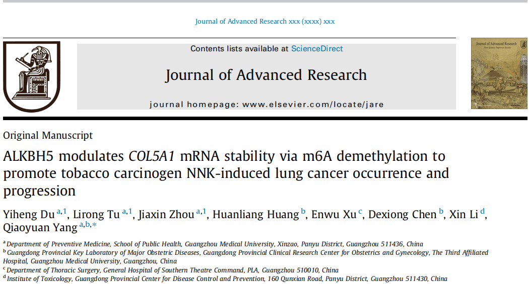 2025年08月12日,包子漫画 杨巧媛教授团队在Journal of Advanced Research杂志在线发表了题为ALKBH5 modulates COL5A1 mRNA stability via m6A demethylation to promote tobacco carcinogen NNK-induced lung cancer occurrence and progression的研究论文。该研究揭示了烟草特异性致癌物NNK通过诱导m6A表观遗传修饰改变调控COL5A1转录本稳定性,促进肺癌发生和发展的分子机制。包子漫画 硕士研究生杜一恒、涂立蓉、周加欣为该论文共同第一作者,杨巧媛教授为论文的唯一通讯作者。