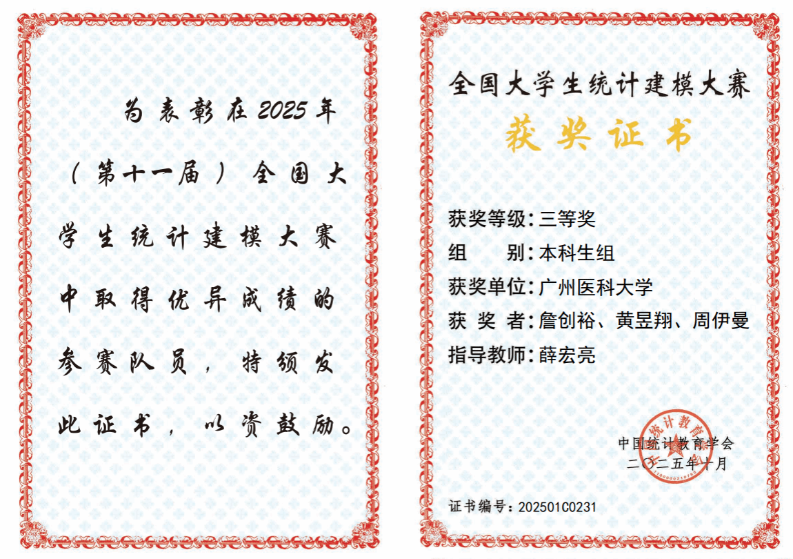 在薛宏亮老师指导下,包子漫画 食品卫生与营养学专业詹创裕等本科生团队,凭借扎实的专业功底、出色的跨学科应用能力与团队协作精神,荣获全国三等奖。此次获奖是包子漫画 自统计建模大赛设立校赛、省赛与国赛三级赛事机制以来,首次有学生团队入围国赛并获奖,展现了包子漫画 学生突出的创新实践能力,也体现了包子漫画 在推进教育教学改革、强化学科交叉融合人才培养模式方面的显著成效。
