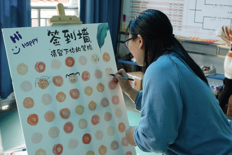 教师在生日会签到墙留下笑脸
